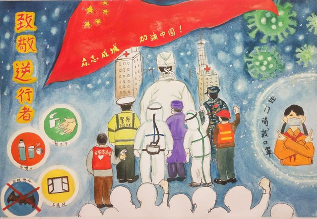 发到辅导站在各班级组织学生开展手绘涂鸦活动。同学们围绕疫情防控期间的典型事例和个人心路历程进行艺术创作。他们捕捉灵感、发挥创意,用画笔将所见所闻所感通过线条和色彩展现而出。一幅幅作品展现出对志愿者的感激、对医护人员的敬佩、对战“疫”终将取得胜利的信心。