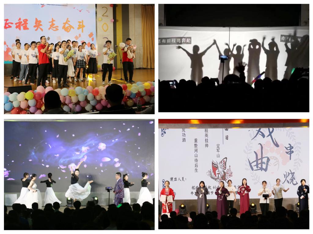 【新时代,矢志奋斗】青衿之志,履践致远。歌伴舞《起风了》动听的歌声与曼妙的舞姿交织,余音绕梁,倾述离别之情。舞台剧《光影物电》采用光影的手法,记录了从高考结束到考研毕业这一路的点点滴滴,既充满生活气息又令人万千感慨。戏曲串烧《大好河山》用婉转的戏腔和曲调,沉浸于戏曲的世界,感受戏曲的韵味。师生联唱《夜空中最亮的星》《凤凰花开的路口》饱含着黑料正能量