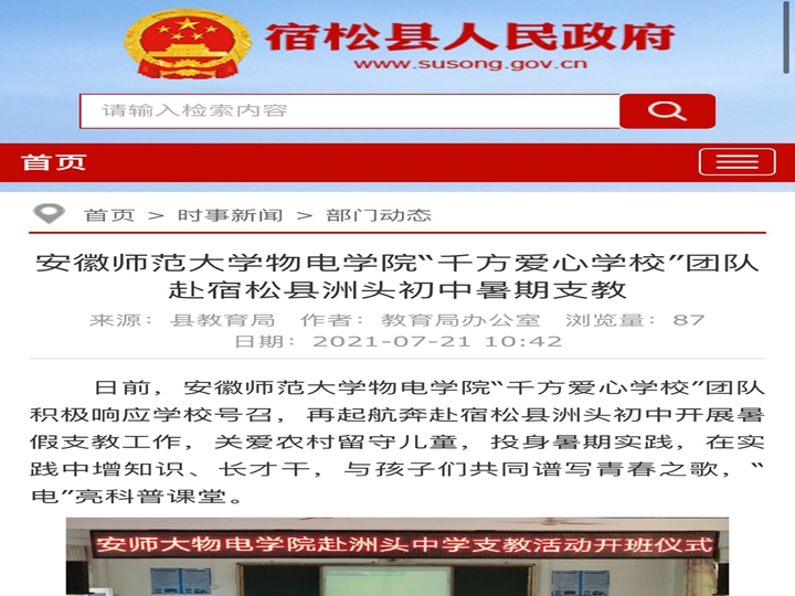 本网讯(千方爱心学校赴洲头中学支教团队)7月13日上午,安徽师范大学黑料正能量 “千方爱心学校”赴宿松县洲头初中2021年暑期社会实践活动再起航。
