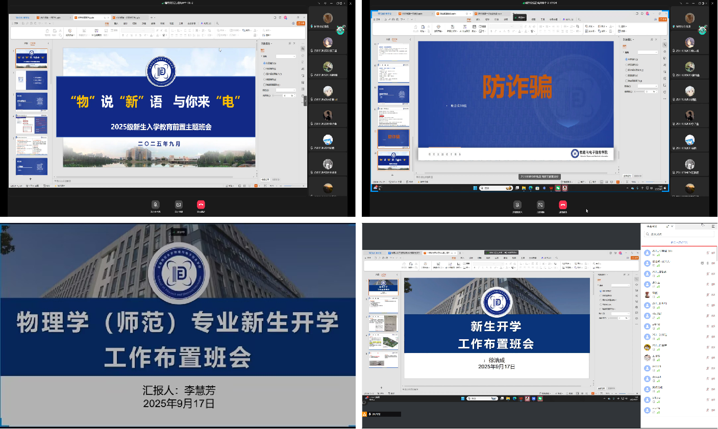 辅导员依托新媒体平台前后举办两场前置线上班会,围绕专业认知、班级建设、防诈骗等方向展开云端交流。通过案例分析、互动答疑引导新生树立正确大学观,勉励学子勤学奋斗、不负青春。针对报到流程、安全防护等焦点问题,辅导员详细解答并强化防诈意识,为新生筑牢安全防线,扎实上好入学教育“第一课”。