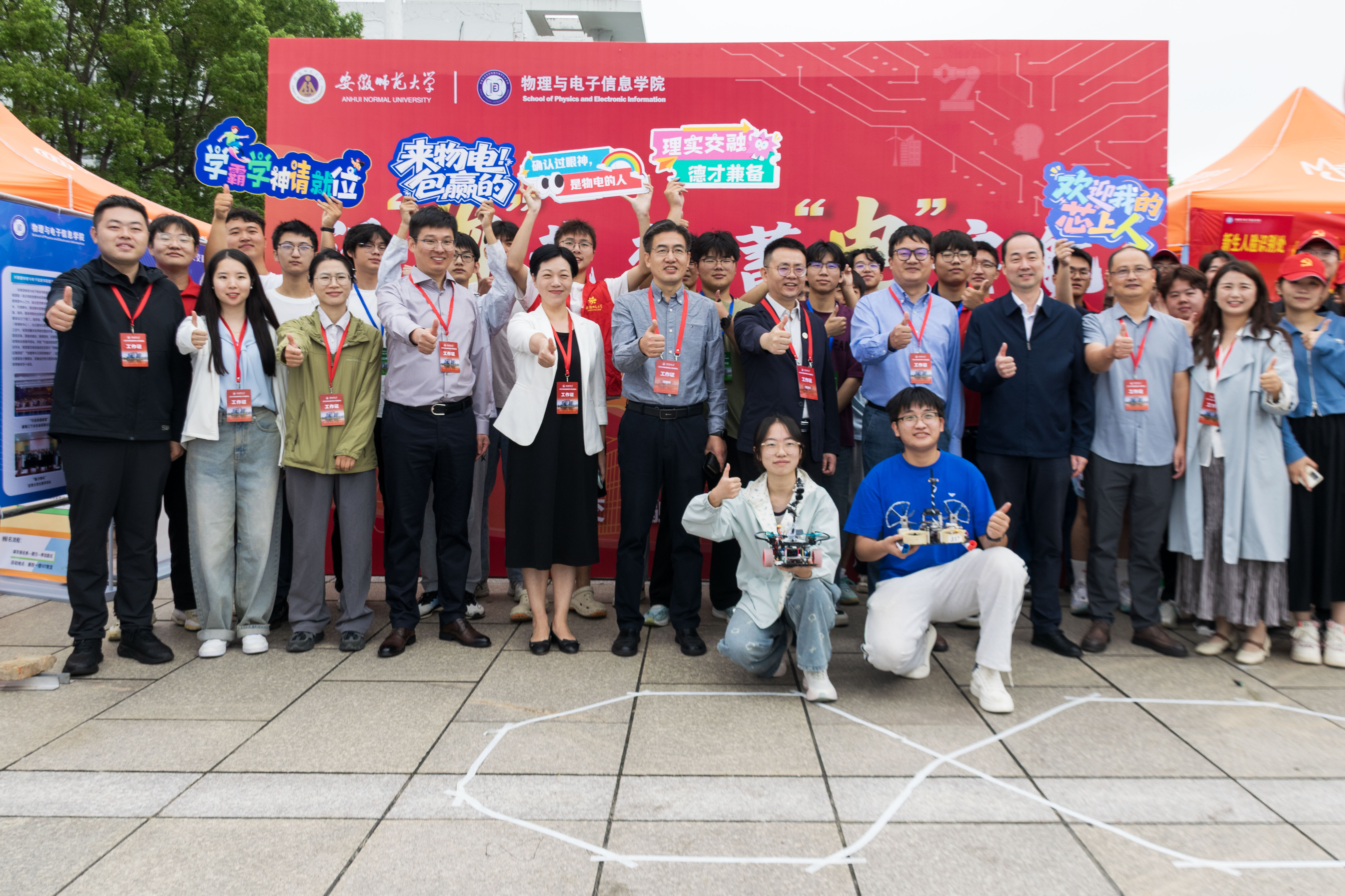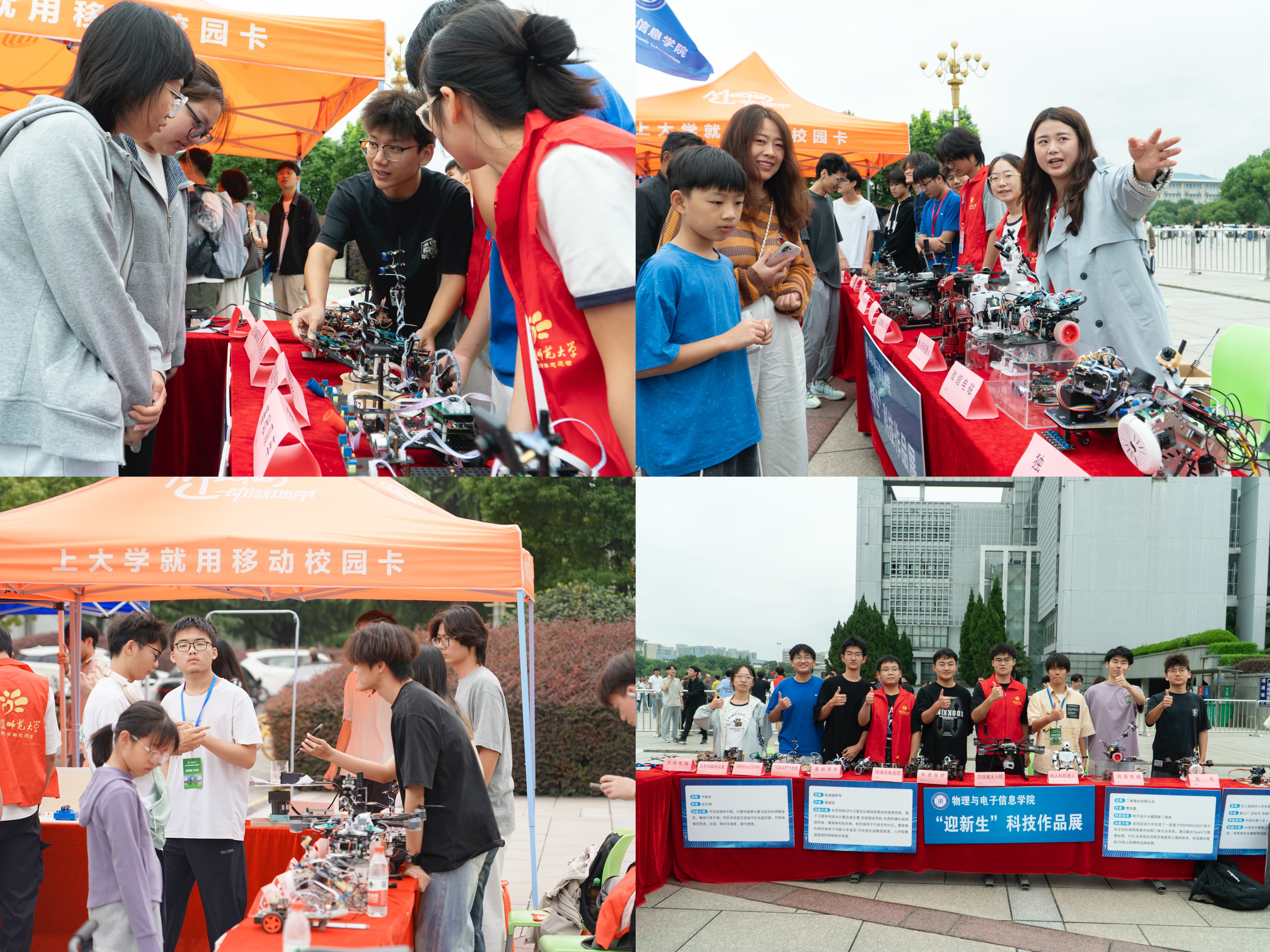 设置“迎新生”学术科技作品展,集中呈现物电学子的创新成果。从仿人机器人、智能汽车、5G远程驾驶车、四旋翼无人机,到物理师范生自制的法拉第磁生电实验装置、受迫振动与共振演示仪等教具,门类丰富、创意十足。学生志愿者现场进行操作演示和专业讲解,帮助新生直观感受学科魅力,增强专业认同。现场还通过黑料正能量