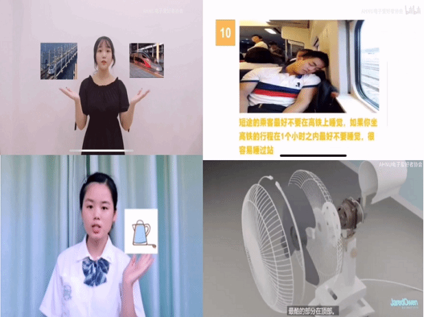 自活动开展以来,电子爱好者协会云科普团队陆续推出了“高铁那些事儿”、“家电维修科普”等系列,坚持贯彻团队“简单易懂生活化,接受科普无门槛”的宣讲宗旨。在“高铁那些事儿”系列视频中,孙冉同学为观众详细讲解了动车和高铁的区别以及动车的几种类型,简单介绍了不同字母开头的动车组列车的区别和特点,还形象的运用车票的差异,来帮助同学们理解记忆。之后从充电宝深入科普了乘坐高铁时禁止、限制携带的物品,提醒观众们乘车的十大注意事项。同样,在另一个生活化科普“家电维护维修”系列视频中,陈佳圆同学从生活中的常见电器入手如电风扇、水壶等,进行电器工作原理的介绍,并从电器结构等方面讲解电器维修方法,科普讲解详细实用,贴近生活,视频中还大量运用了动画视频讲解,使讲解更加形象生动,彰显青年科普充满活力的特点。
