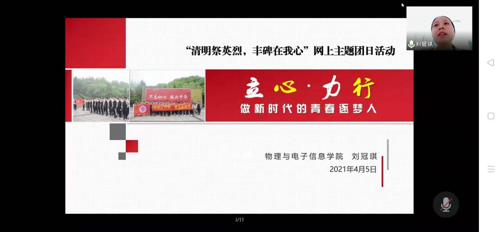 辅导员刘冠琪、团委委员及部长、2020级物理拔尖班全体团员参会。刘冠琪做《立心·力行 做新时代的青春逐梦人》党史青传微宣讲,切实讲好党的故事,革命的故事,英雄的故事。 宣讲结束后,播放短片《铭记!用生命守护生命的勇士》,团员代表任小魏、吴倩倩、邢广基结合宣讲内容和短片,分享最打动自己的烈士故事。