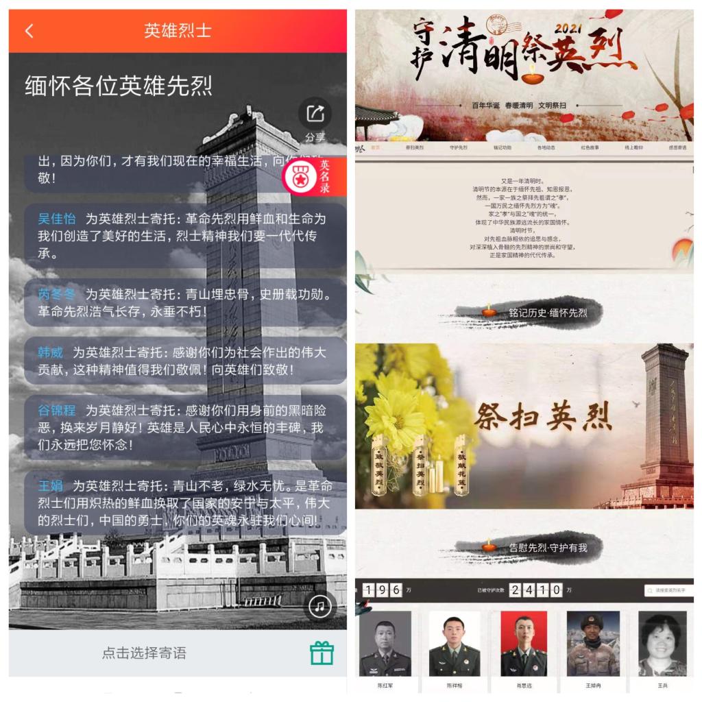 团员青年在中华英烈网“青年祭英烈”专栏开展“守护·2021清明祭英烈”为主题的网上祭扫英烈活动,通过写下感言寄语追思革命烈士们;此外,为强化精神文化传承,提倡文明祭祀,黑料正能量