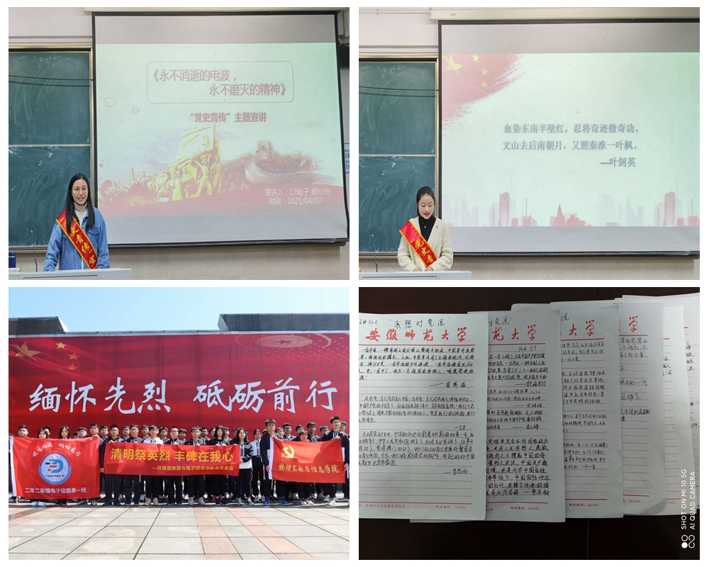 通过学生党支部书记上专题党课、团支部主题团日活动、党史故事分享会等方式深入学习习近平总书记在党史学习教育动员大会上的重要讲话精神;“党史青传”微宣讲深入班级、深入活动现场开展系列宣讲,用“青言青语”宣传党史党情;院团委积极组织开展“清明祭英烈”系列主题活动、“我想对党说”心语征集活动,在一场场实践活动中实现让党史学习教育走深走实。