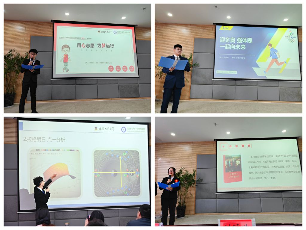 交流会上,17名参评同学根据抽签顺序,结合PPT内容依次汇报。他们中有人投身志愿服务一线,参加社区义警工作、助力防疫志愿服务、做好运动打卡迎冬奥,身体力行做一件有意义的事;有人把阅读当作一种习惯,在书海中汲取养分,从读一本好书中感受大家风范;有人聚焦专业前沿,积极动手实现课程设计或撰写学术论文,用实际行动高质量完成一项专业作业;有人与优秀校友零距离接触,共同探讨学习与人生的未来规划,在走访一位校友中不断明确大学目标,确定奋斗方向。四个方面的事迹各有特色,但无不诠释着师大学子自强不息、积极进取、知行合一的优良品质。