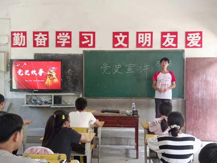 千方爱心学校赴潜山市昆仑小学支教团队于7月12日下午开展“党史故事”主题宣讲活动,活动由队长马立铭主持。