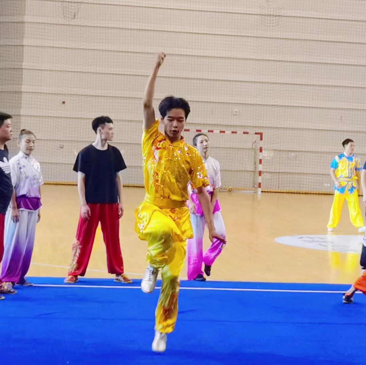 老师和同学们第一时间联系戎天琦同学送上了祝贺。去年刚入学,戎天琦就通过选拔加入了校武术队,开启了备战省运会的征程,从未参加过专业比赛的他受到了教练的严格“关照”,晚自习结束、周末放假,别人在休息的时候他却正在训练场上挥洒着汗水,长期与剑、棍打交道使得他的身体也是伤痕累累,十分疲惫。长战线的训练计划、高强度的训练要求,难免会让人产生放弃的念头,“教练总是说,苦不会白吃的,看着手上磨的茧,想想未来站在领奖台上的你,力量总还是能逼一逼的。”戎天琦笑着说道,正是教练一次次的手把手指导,队友们的一句句相互鼓励,相互帮助,才有了今天赛场上的精彩表现。