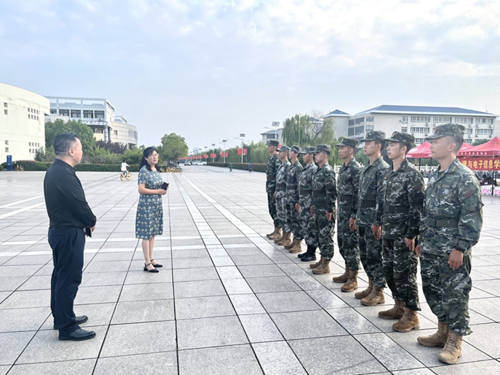 党委书记李娟、党委副书记黄友生来到敬文图书馆南侧广场军训场地,深入新生军训现场,看望慰问军训教官及2022级全体军训学生。