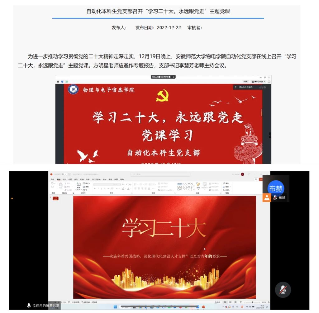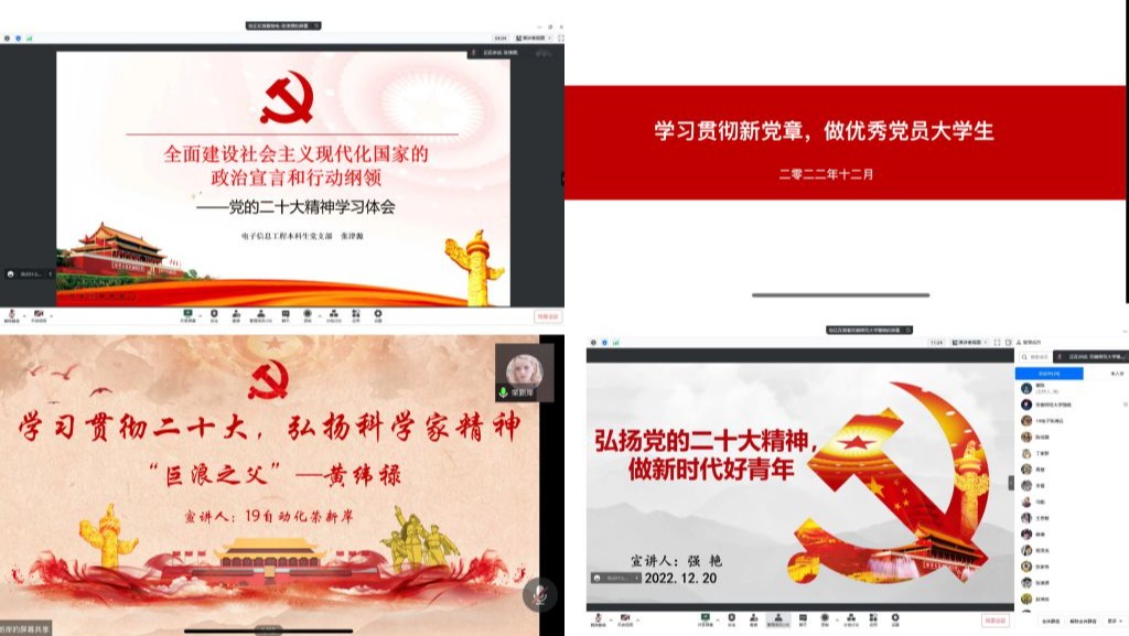 “理响物电”党的二十大精神师生宣讲团走进各个学生党支部,以《弘扬党的二十大精神,做新时代好青年》《学习贯彻二十大,弘扬科学家精神,“巨浪之父”--黄纬禄》等为题,以更具“青年感”、更有“青年味”的形式开展系列宣讲活动。宣讲报告既有理论高度,又有思想深度,主题鲜明、内容丰富,贴近实际,深入党员欢迎。