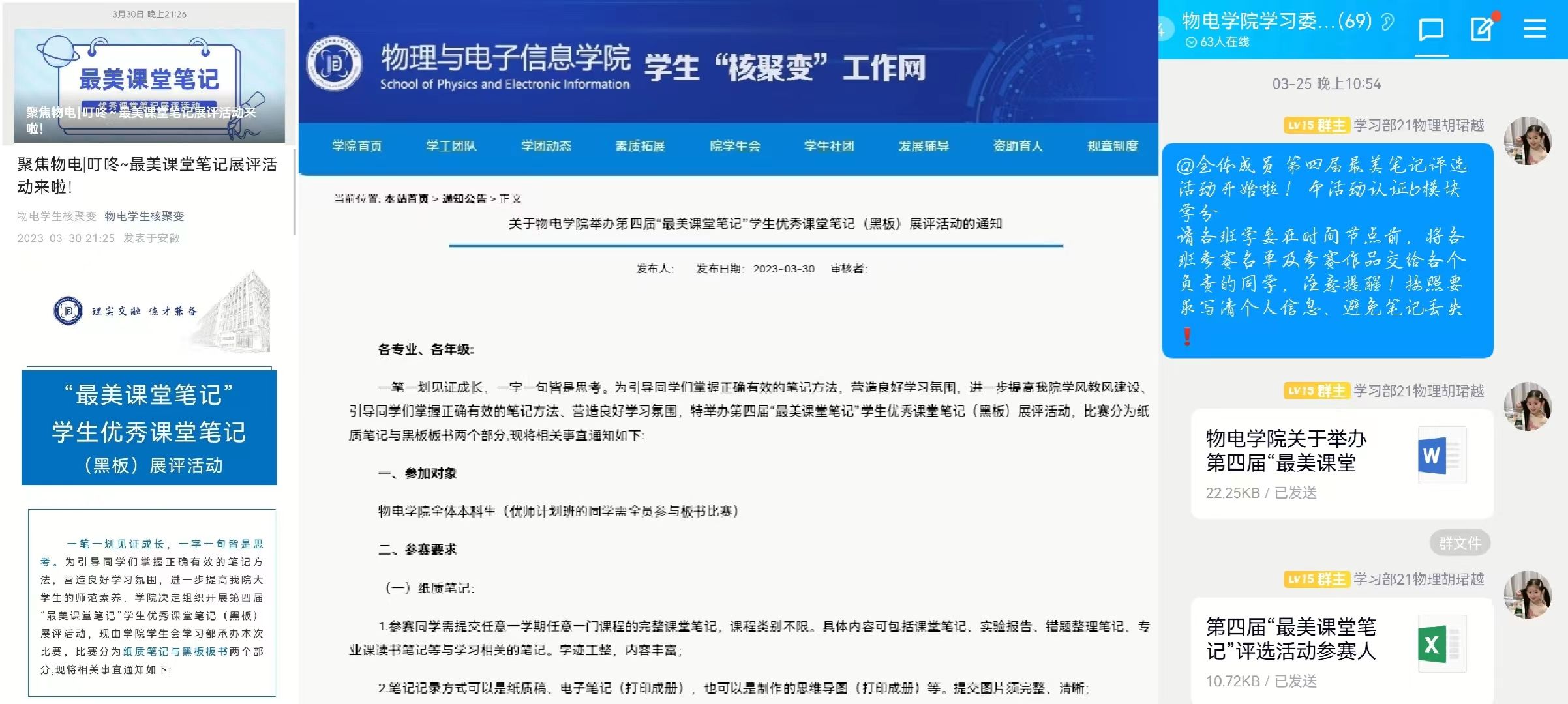 宣传部以及各班级学习委员,线上线下同步推进,积极运用QQ工作群、公众号等平台推广宣传,线下认真收集整理各班级递交参赛作品,并邀请专业老师指导。历时7天,累积共收集课堂笔记和黑板板书602份,工作人员依据校级评选标准,坚持公平公正原则,从中选出100份课堂笔记与71份板书作品参与院级最终评选。