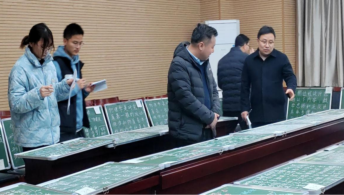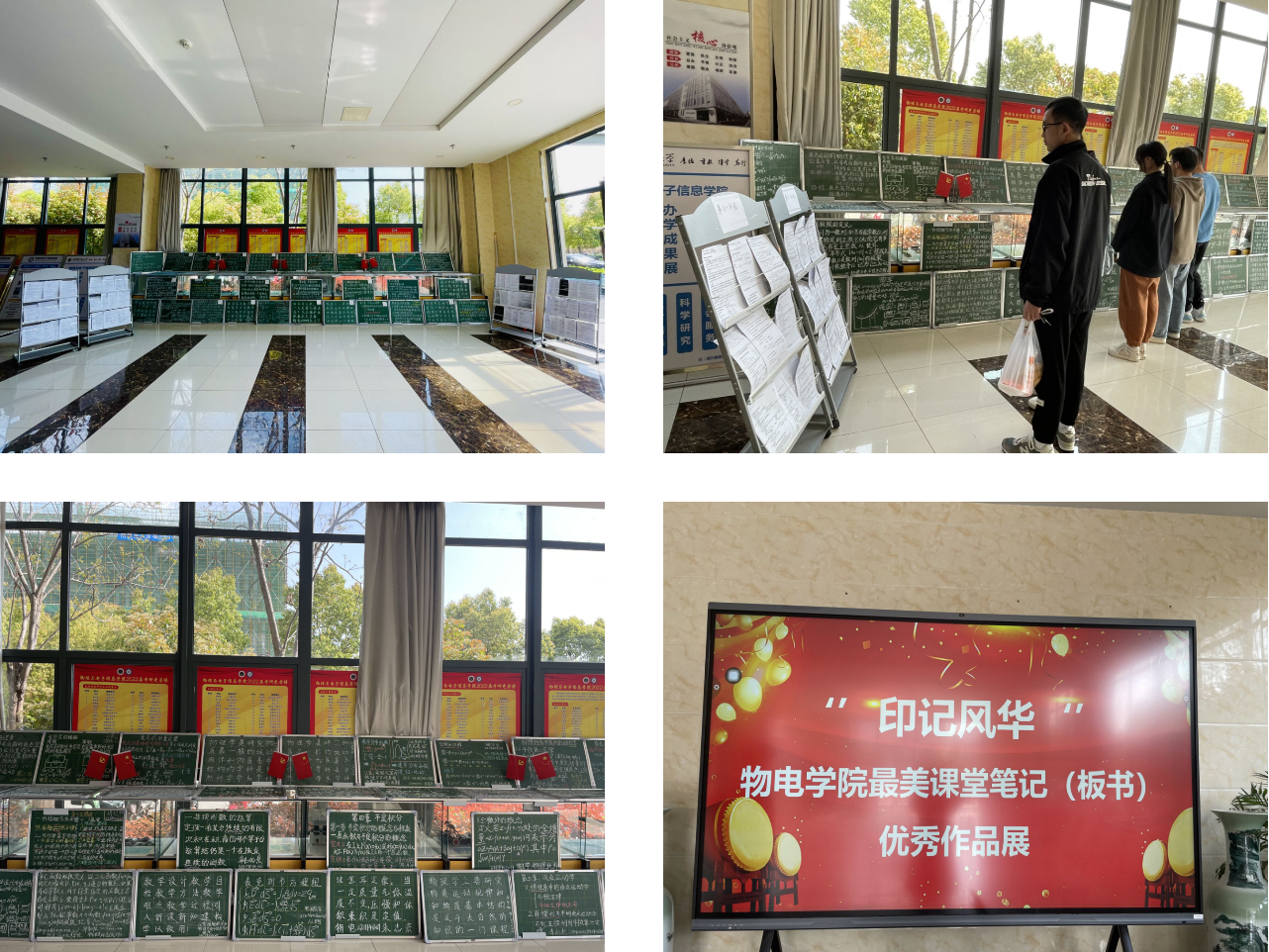 师生合作,推动实践育人走深走实。展评现场,各位专业老师与学长学姐代表根据现场两类作品编码顺序,采用现场评析、现场打分、现场统分的方式进行评议,最终结果根据八位评委打分的平均分进行排名得出。黄友生表示笔记是学生看书学习时着手于笔尖,流于心间跳动的字符,也是我们课堂学习效果的直接呈现,而气韵流畅、潇洒飘逸的粉笔字更是每一位师范生的必备技能,勉励同学们专注课堂学习,夯实专业基础,用最美青春邂逅最美笔记,涵养优良学风。优秀笔记与板书作品在活动结束后布置于物电楼大厅,面向所有物电师生展出。